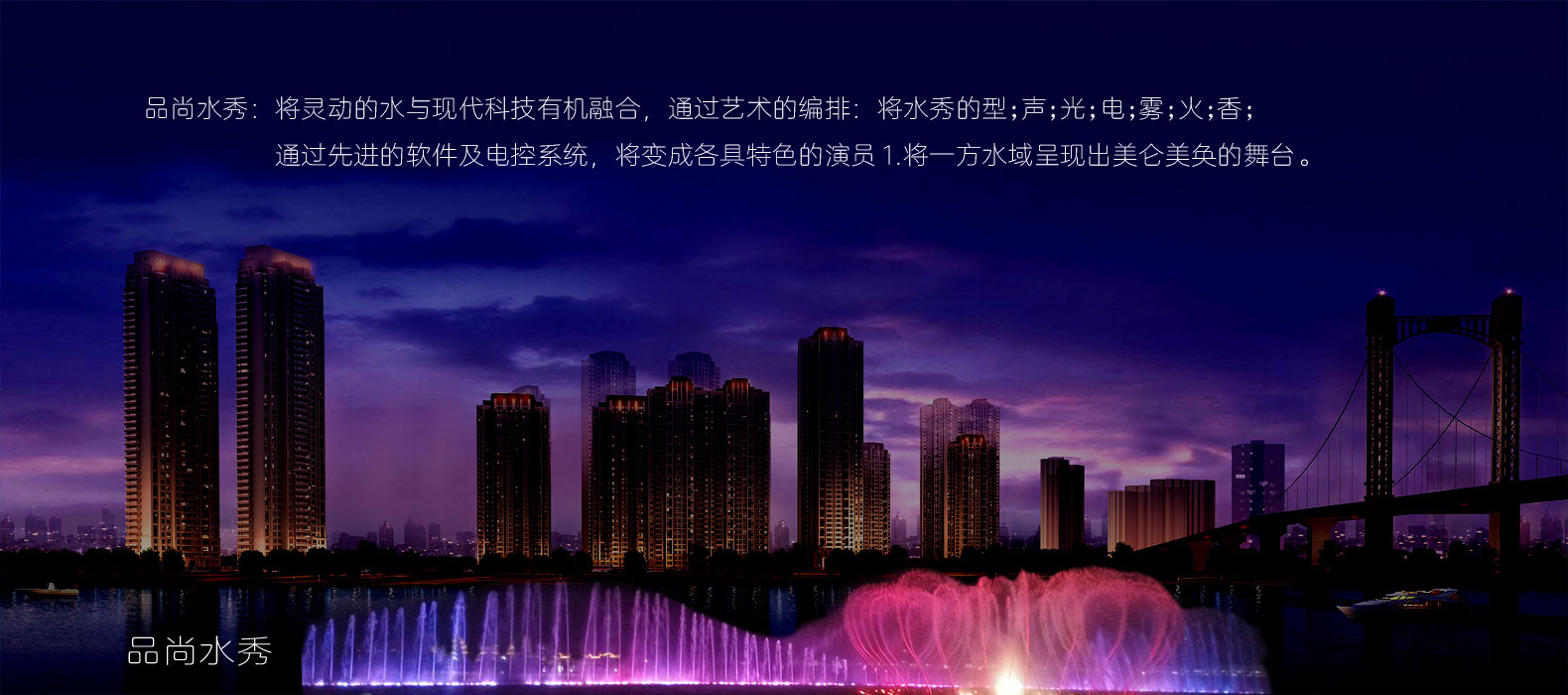 品尚水秀 隸屬于寧波品尚景觀工程有限公司, 品尚水秀是一家享有國(guó)際聲譽(yù)的舞美聲光秀水景跨國(guó)企業(yè);業(yè)務(wù)范圍涉及音樂(lè)噴泉,程控噴泉,廣場(chǎng)噴泉,城市景觀噴泉,湖內(nèi)浮筒噴泉,小區(qū)噴泉,大型室內(nèi)噴泉的工程設(shè)計(jì)施工,霧森系統(tǒng),人造冷霧,高壓人造霧...